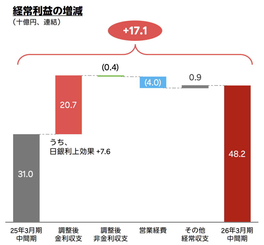 日銀の政策金利引き上げ効果 今期の経常利益増加(+17.1十億円)のうち、日銀の利上げ効果は約76億円と推定されています。これは確かに大きなインパクトですが、利上げは一時的なイベントではなく、金利環境の構造的な変化です。