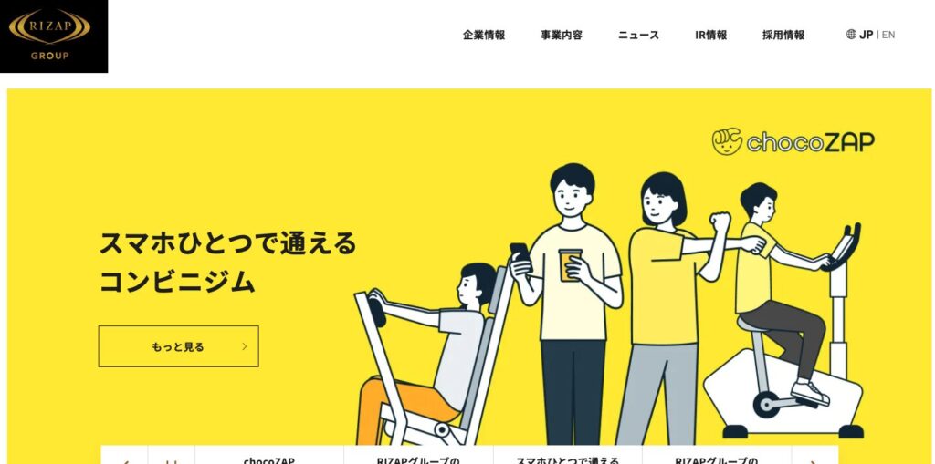 ライザップグループ株式会社は、パーソナルトレーニングジム「RIZAP」を展開する企業として知られていますが、現在の主力事業は2022年7月に開始した24時間無人ジム「chocoZAP」です。同社は札幌証券取引所アンビシャス市場に上場しており、RIZAP関連事業のほか、アパレル、美容、エンターテインメントなど多様な事業を展開しています。