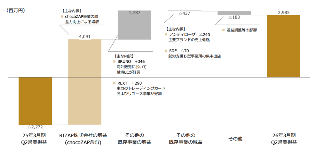 現在、ライザップグループの収益はRIZAP関連事業(chocoZAP含む)に大きく依存しています。上期累計でこのセグメントが営業利益23.4億円を計上し、グループ全体の営業利益29.9億円の大部分を占めています。