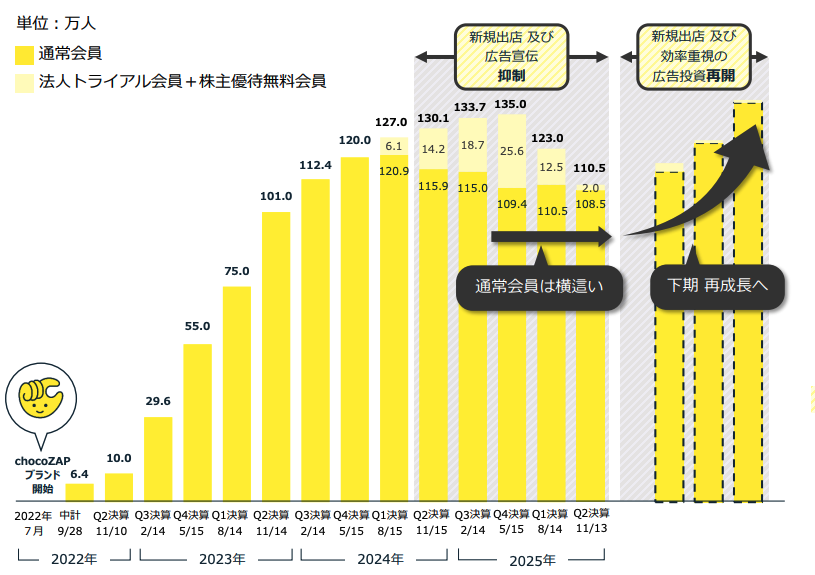chocoZAP事業は2022年7月の開始から2024年前半まで急拡大を続け、約2年間で1,800店舗以上、会員数130万人超という驚異的な成長を遂げました。しかし2024年4月以降、意図的に新規出店と広告宣伝を抑制し、収益基盤の確立に注力する戦略に転換しました。