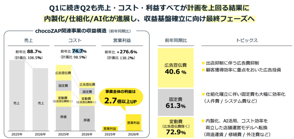 広告宣伝費は前年同期比40.6%まで抑制され、固定費は61.3%、変動費(広告宣伝費除く)は72.9%まで削減されました。これは内製化、AI活用、コスト効率を両立した店舗運営モデルへの転換が進んだ結果です。