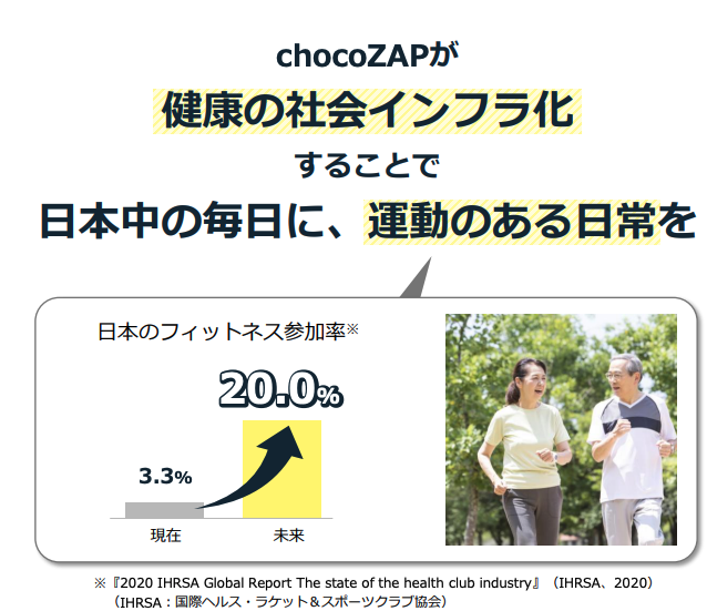chocoZAP事業の成長ドライバーは持続可能です。なぜなら、日本のフィットネス参加率は現在わずか3.3%で、欧米の主要国と比較して著しく低い水準にあるためです。同社が目指す20%という目標は、既存市場の約6倍の規模を意味します。