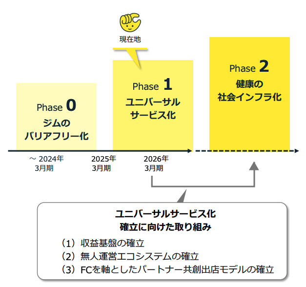 中長期的には、chocoZAP事業は「Phase 1: ユニバーサルサービス化」から「Phase 2: 健康の社会インフラ化」へと移行する段階にあります。