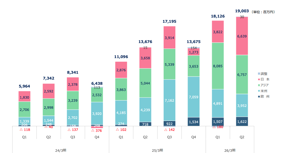 前四半期との比較で注目すべき点: Q1(26/3期)の売上高は430億円、Q2は445億円と、前四半期比で約3.4%増加。四半期ベースでは緩やかな成長を維持していますが、前年同期比の39.6%増という高成長率は、主に前年の基準値が低かったことも影響しています。