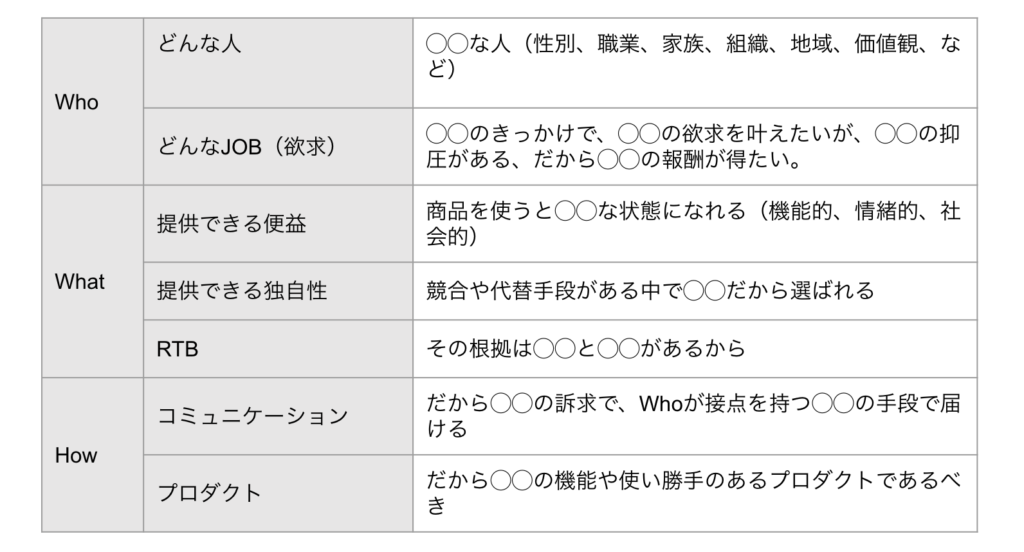 詳しくは「マーケティングのWho/What/Howを明確化して実行しよう」の記事で解説しています。