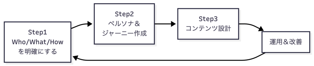 | Step2 | ペルソナとカスタマージャーニーマップを作成する | 顧客像と購買プロセスの可視化 |