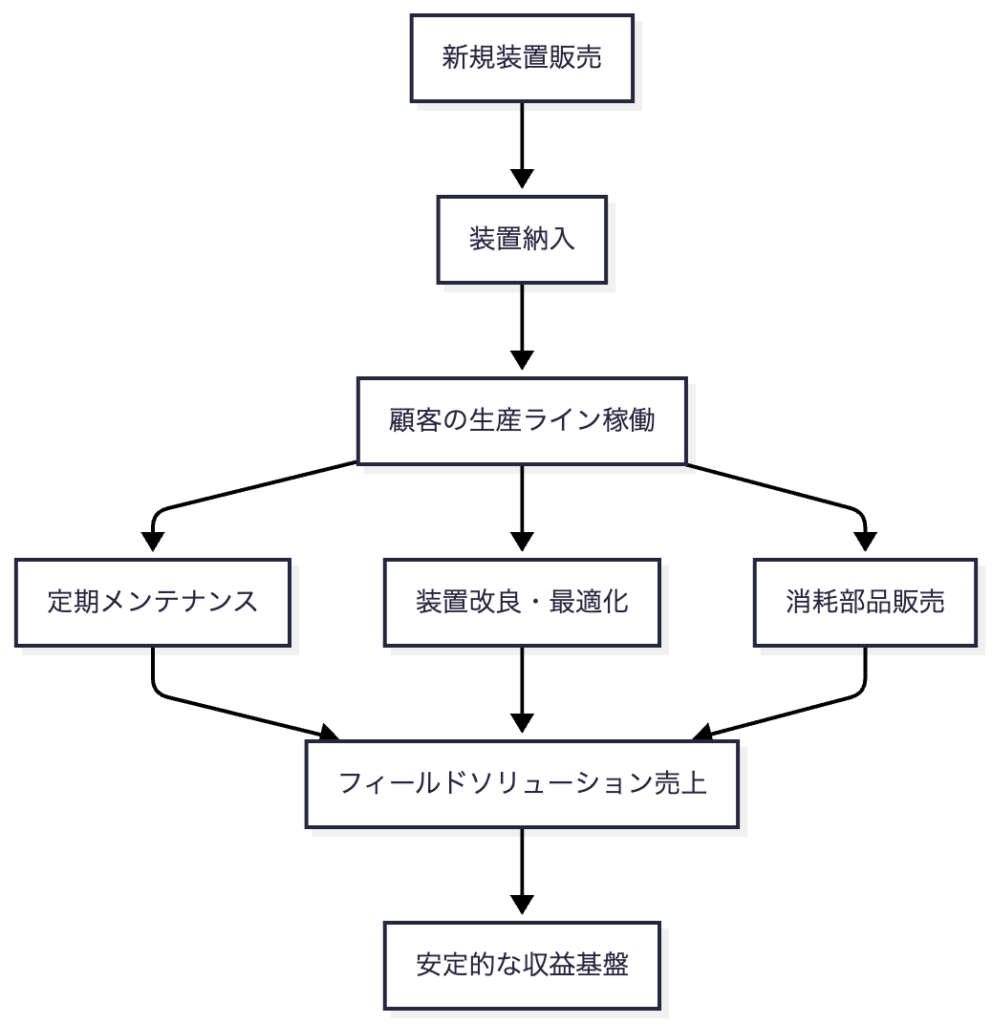 新規装置販売は市場環境に左右されますが、フィールドソリューションによる継続的な収益は、事業の安定性を高めます。これは、サブスクリプションモデルやSaaSビジネスと同じ考え方です。