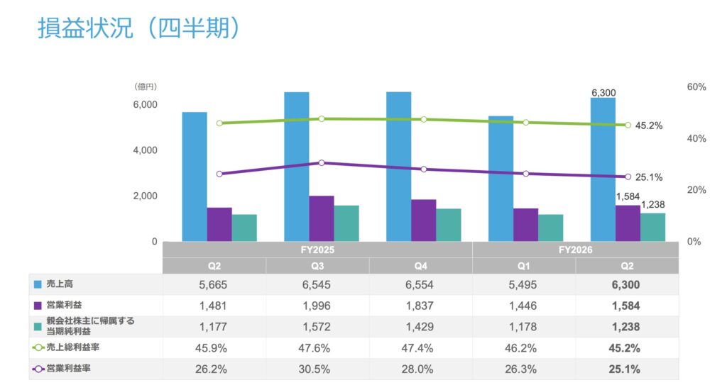 売上は前年同期比で11.2%増の6,300億円と二桁成長を達成しています。営業利益も1,584億円と堅調で、営業利益率は25.1%という高水準を維持しています。