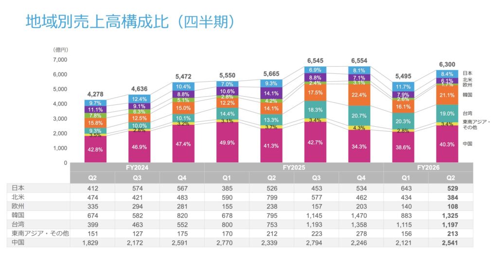 中国が全体の4割を占める最大市場となっていますが、前四半期(38.6%)と比較するとやや構成比が増加しています。一方で、韓国と台湾も合わせて4割を占めており、アジア地域が売上の中心であることがわかります。