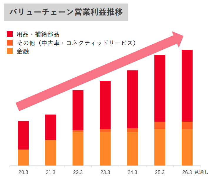 第2四半期では、バリューチェーン収益が約1,300億円のプラスに寄与し、そのうち金融事業だけで約600億円の増益となっています。また、バリューチェーン営業利益は過去数年で右肩上がりに成長しており、新車販売の収益を補完する重要な柱になっていることがわかります。