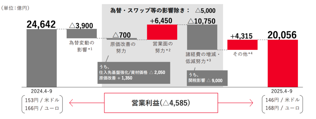 第2四半期累計の営業利益は前年同期比で約5,000億円減少しましたが、これは主に米国関税の影響(約9,000億円のマイナス)によるものです。それでも営業利益率8.1%、通期見通しで3.4兆円という水準を維持できているのは、以下の3つの努力があったからです。