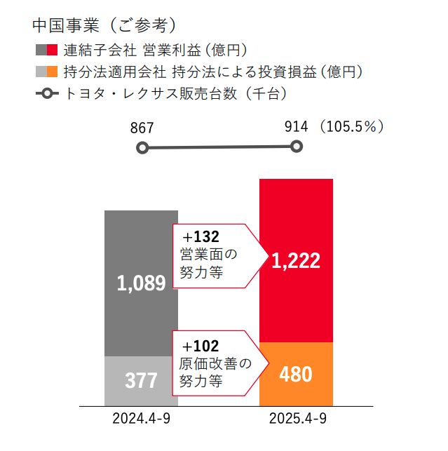 また、決算資料によれば、中国事業の営業利益は連結子会社で約102億円増、持分法適用会社でも増益となっており、単に台数を伸ばすだけでなく、収益性も確保できています。