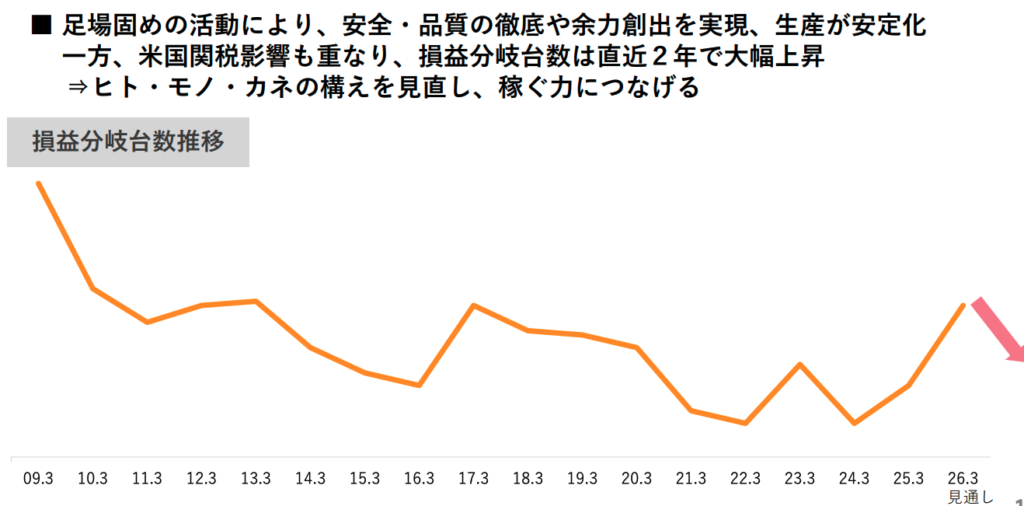 一方で、トヨタにも課題があります。決算資料には「足場固めの活動により、安全・品質の徹底や余力創出を実現、生産が安定化。一方、米国関税影響も重なり、損益分岐台数は直近2年で大幅上昇」という記述があります。